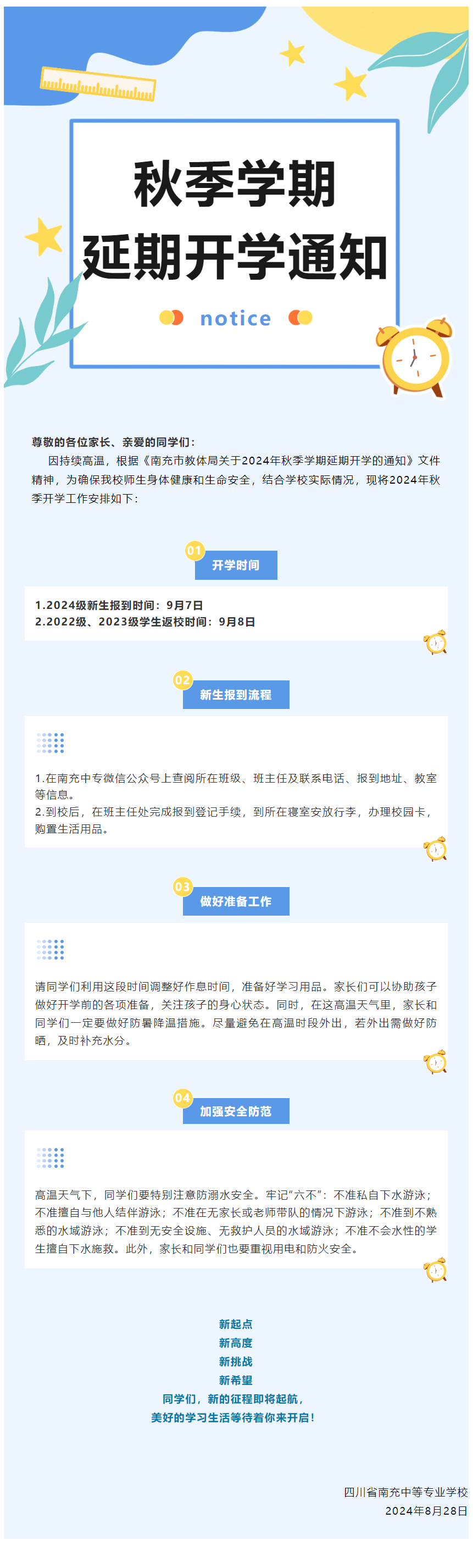 南充中專(zhuān)2024年秋季學(xué)期延期開(kāi)學(xué)通知
